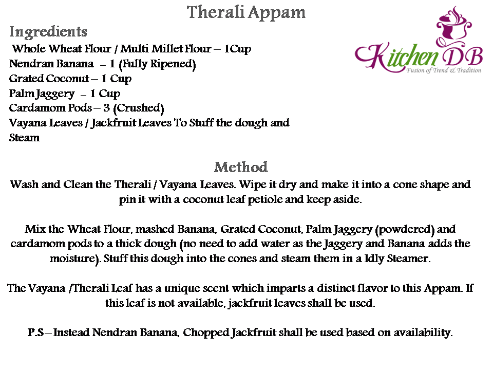 Whenever I visit, I ensure that I learn some new recipes from them. This time it is a steamed delicacy that is made using the fresh Vayana Leaves / Therali Leaves (Similar to Bay Leaf in shape and flavor, but bigger in size). It is easy to make the recipe with the goodness of Wheat Flour along with Nendran Banana / Jackfruit. Thanks to Krishnan Uncle and Indira Mami who patiently demonstrated me the making of this delicious and healthy Appam.