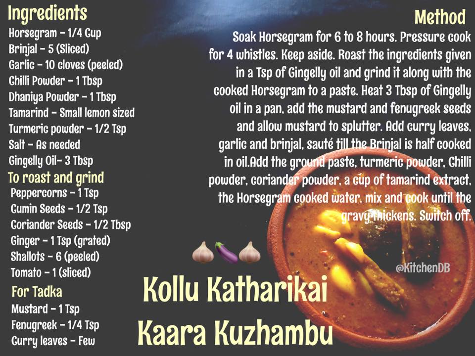 Here is a healthy Kuzhambu recipe using the miracle Pulse Horse gram / Kollu which helps in weight loss in combination with farm fresh Brinjals. It’s Kollu Katharikai KaraKuzhambu. Horse gram has a lot of health benefits, like controlling Diabetes, protecting the liver and treating kidney stones.