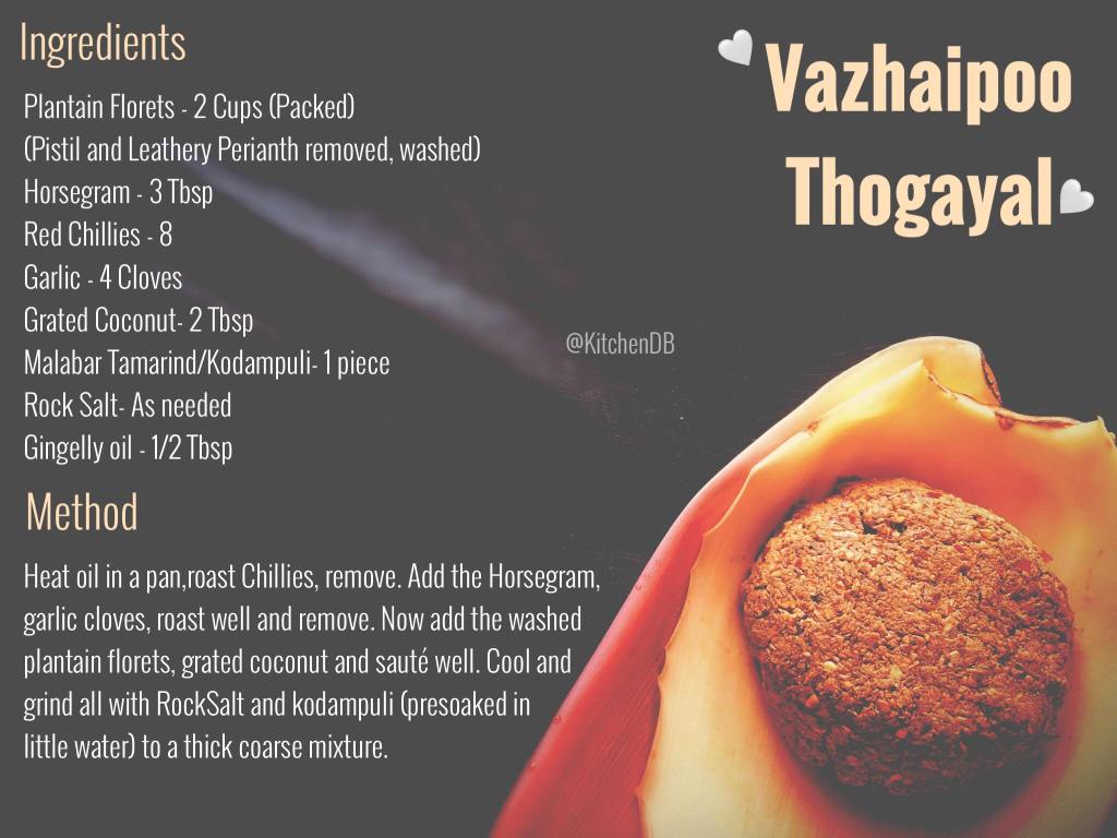 Hi all 🙂 Here is a very healthy Thogayal recipe using another Superfood, the Banana Florets / Vazhaipoo. The health and medicinal benefits of this Banana Florets are innumerable. They are very good for diabetic patients to keep their sugar levels under check. It improves lactation in nursing mothers. It is rich in Vitamins A, C and E, loaded with fibre and has good amounts of potassium. It also cures menstrual problems in women, aids in weight loss and rich in antioxidants. Including Banana florets in your meal at least once in a week will help in maintaining gut health. I have used homegrown Banana Florets, coconut and Kodampuli from native home garden in this recipe. Using Ghee or Gingelly oil is recommended for getting the complete health benefits of this superfood.