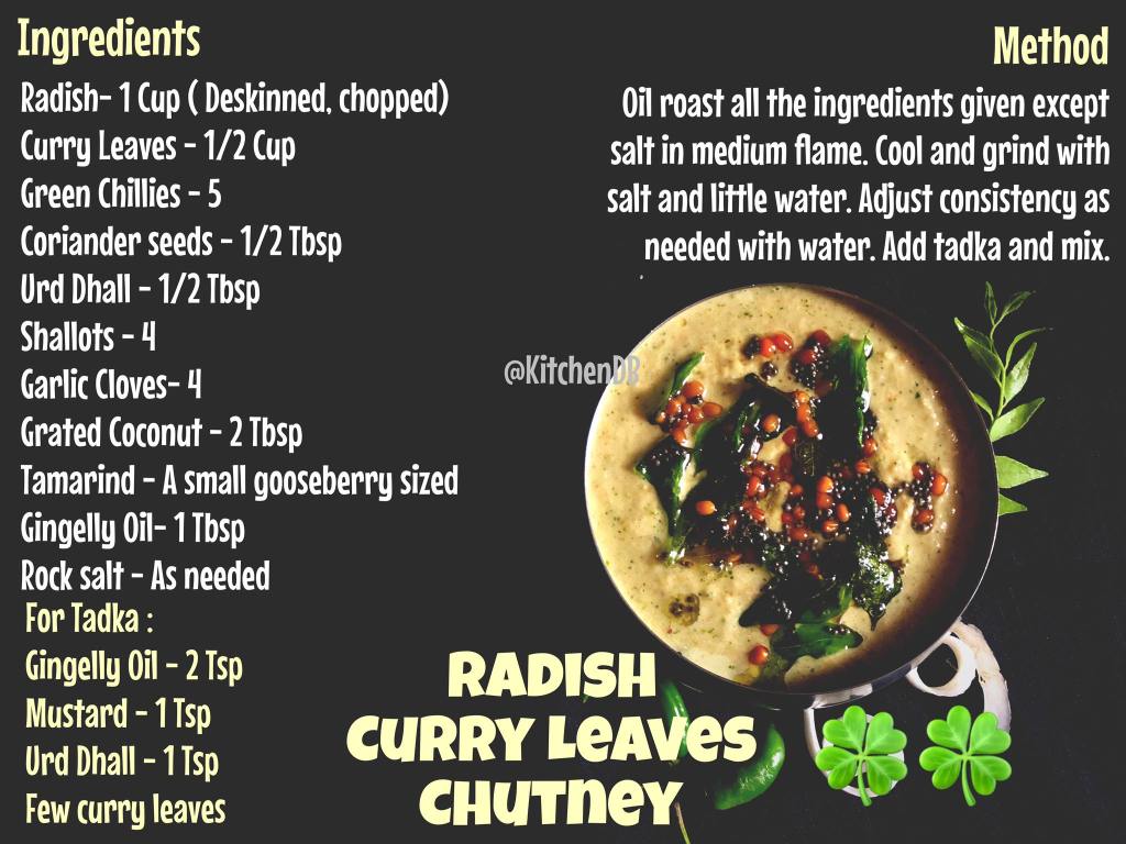 Hello all 🙂 Bored of the usual coconut chutney, Kaarachutney and Tomato Chutneys?? Here is a very healthy and tasty blend with farm-fresh Radish, Green Chillies and Curry Leaves. This is a very flavourful Chutney which can be made thick to be mixed with rice or little thin to go with idli and dosas. Trust me, you will want to eat more just for the taste and flavour of this chutney.