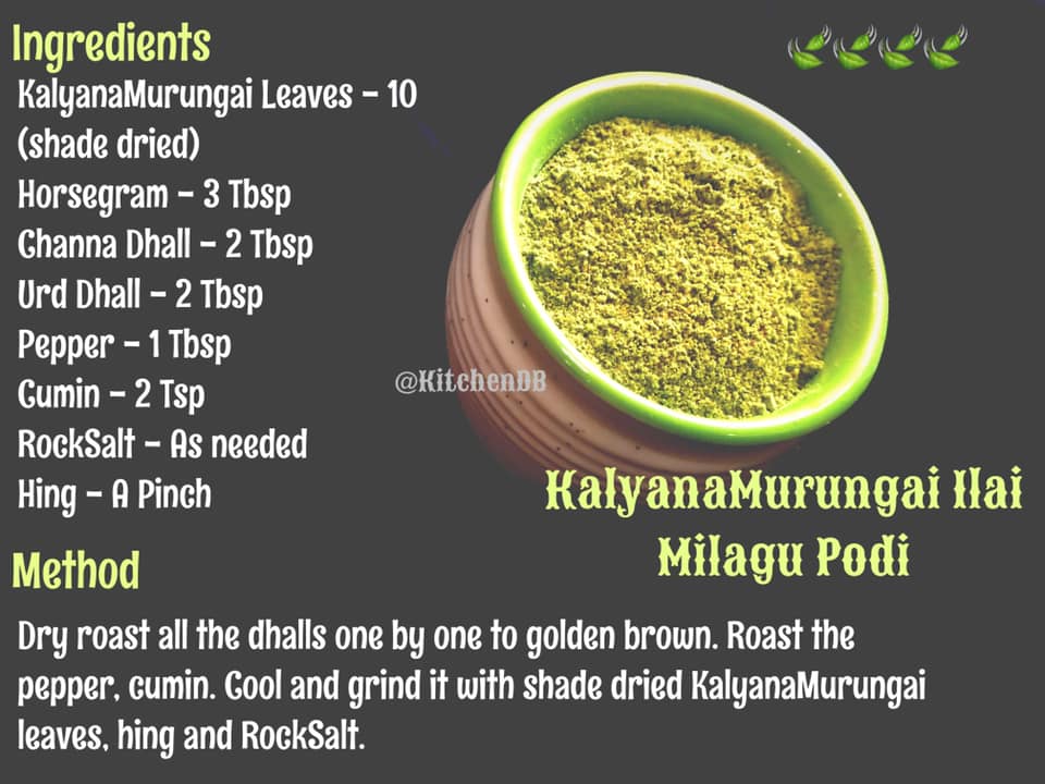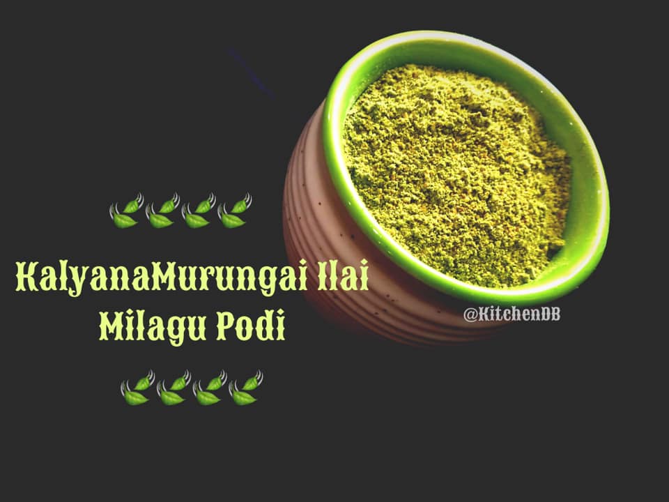 Hi all Here is a very healthy and medicinal Podi which is best to cure severe cough and cold, in my Podi Series. A rice mix using the medicinal KalyanaMurungai/ Mullumurungai leaves. I had earlier shared Mullumurungai Adai and Vadai here.