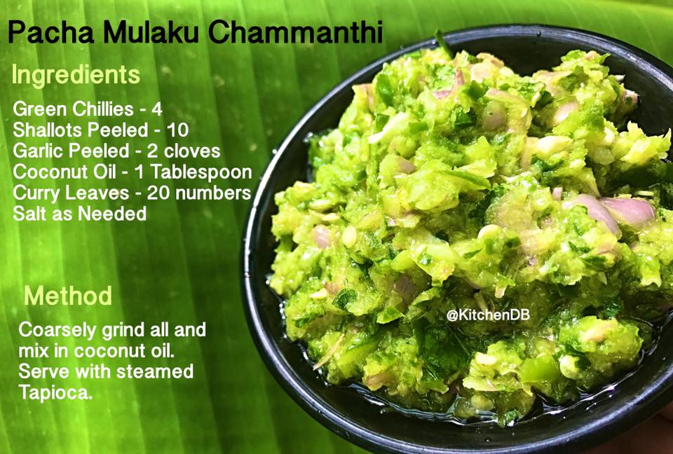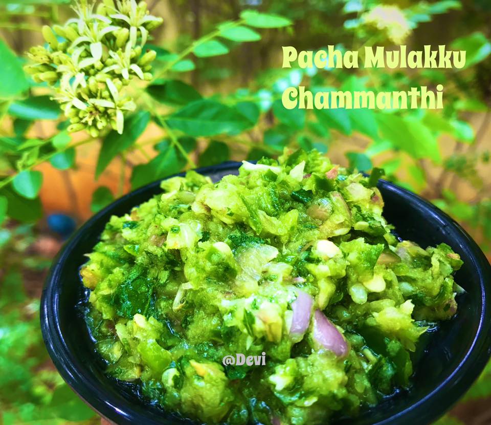 Another favorite household recipe that is very regular at home and can be made in a jiffy. Pachamulaku Chammanthi / Green Chilly Shallots Chutney is a spicy chutney recipe normally made using the spicy green chilly variety from Kerala Kanthari Mulaku (Bird’s eye Chillies), shallots and coconut oil. Due to unavailability of that variety I have made it with normal green Chillies,home grown fresh curry leaves and coconut oil made from native home grown coconuts. I have also added some fresh homegrown curry leaves.