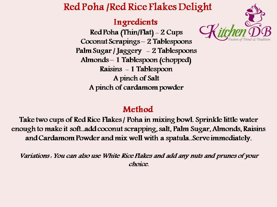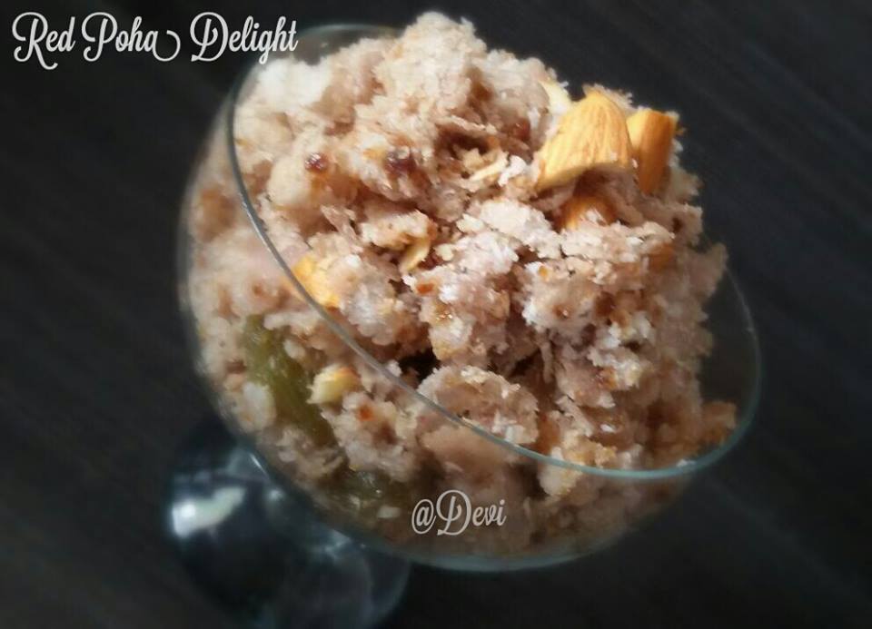 Here is another easy recipe which needs no cooking and can be made in a few minutes which is a wholesome food anytime, be it a breakfast or evening snacks for children or a filling dinner.Red Poha being rich in fibre and Iron makes it a nutritious food.