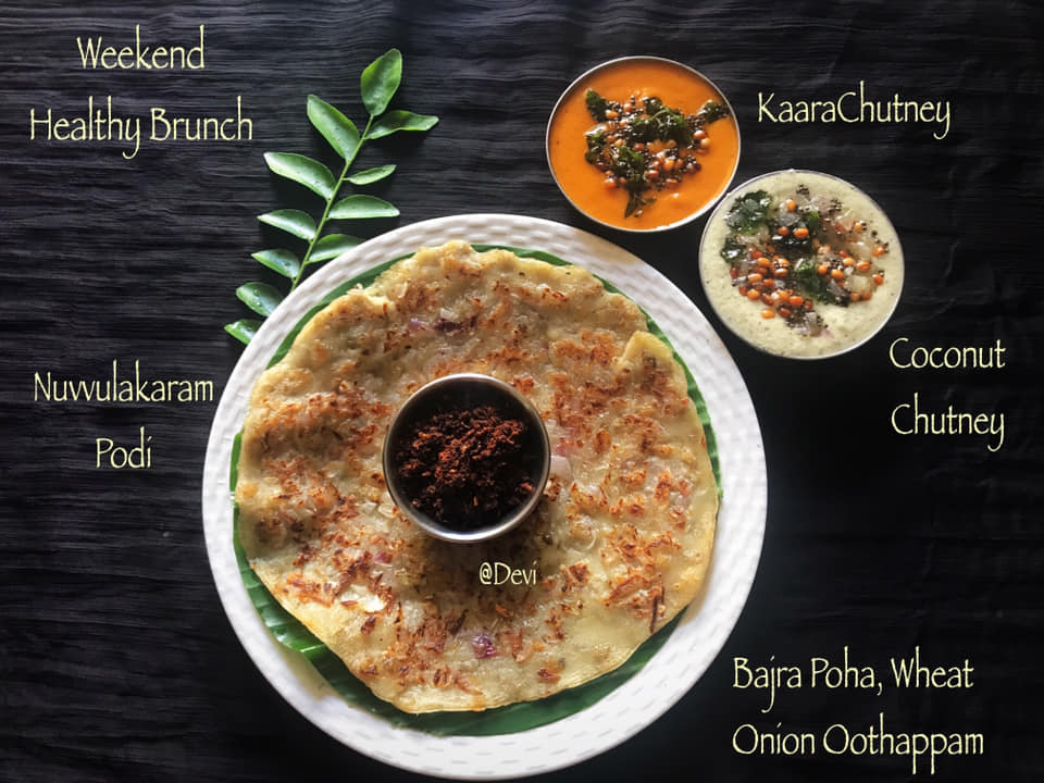 Home Processed Wheat flour and Bajra/Kambu Aval Onion Oothappam paired with KaaraChutney, Coconut Chutney with Onion Tadka (home grown sweet coconuts) Andhra special Nuvvulakaram Podi with cold pressed Gingelly Oil.