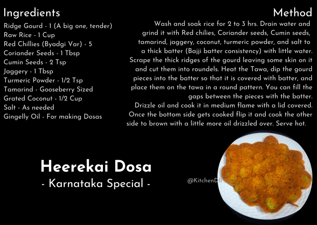 A popular recipe from Karnataka using the fresh tender Ridge gourd – Heerekai Dosa / Ridge gourd Dosa is something I learnt from one of my friend who is a native of Karnataka few years back. Whenever I get tender gourds from farm or from my Keerai Thatha, I immediately make this as this one has become a family favorite since I started making them . More than Kootu, Sambar, Thogayal, Chutney we prefer having this vegetable this way.