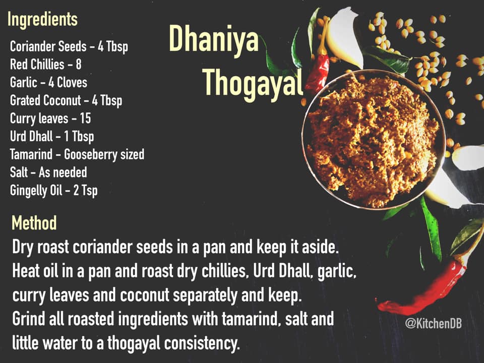 Hope you all are doing good and staying safe. Covid is still here, so let us be more careful and follow all safety measures to overcome this pandemic. For this week I am sharing a healthy thogayal using Coriander seeds / Dhaniya / Kothamalli Vidhai.