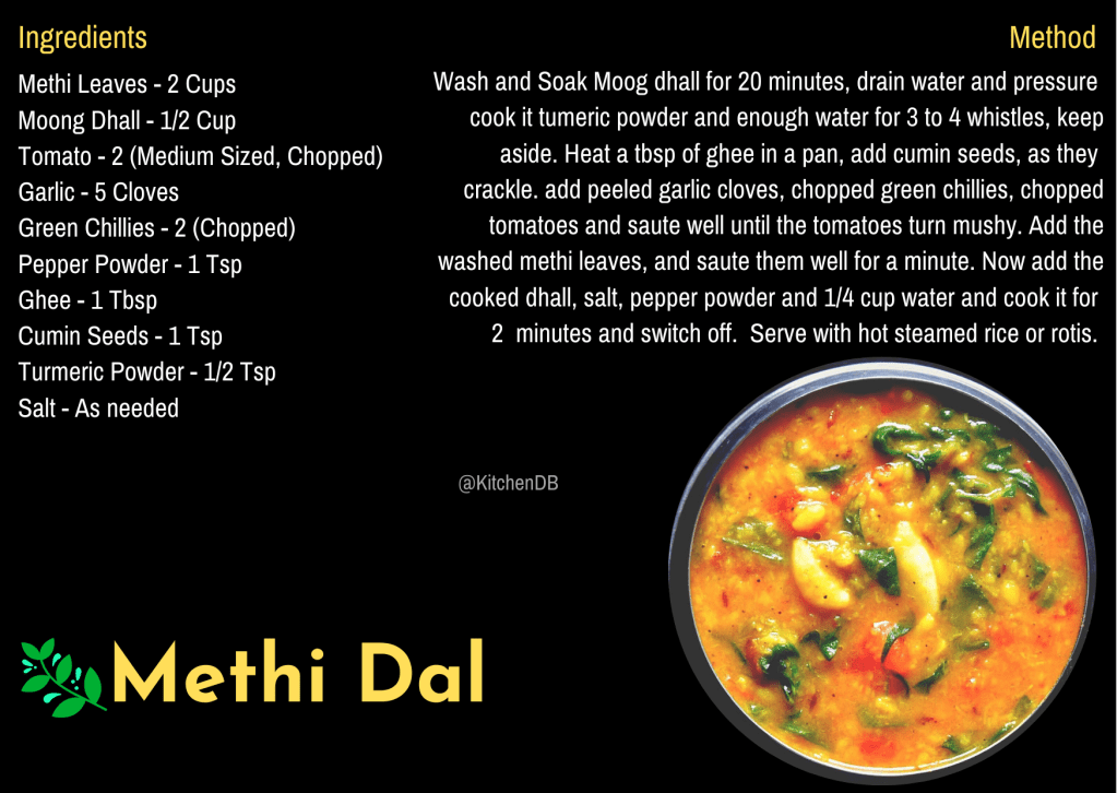 Methi Dal / VendhayaKeerai Parupu Masiyal – A very tasty, flavourful and healthy dal recipe using the farm-fresh Methi / Fenugreek leaves. Methi leaves has enormous health and medicinal benefits. It cures all menstrual disorders in women of consumed regularly. With just few ingredients you can make this dal which pairs well with hot steamed rice as well as rotis/ parathas.